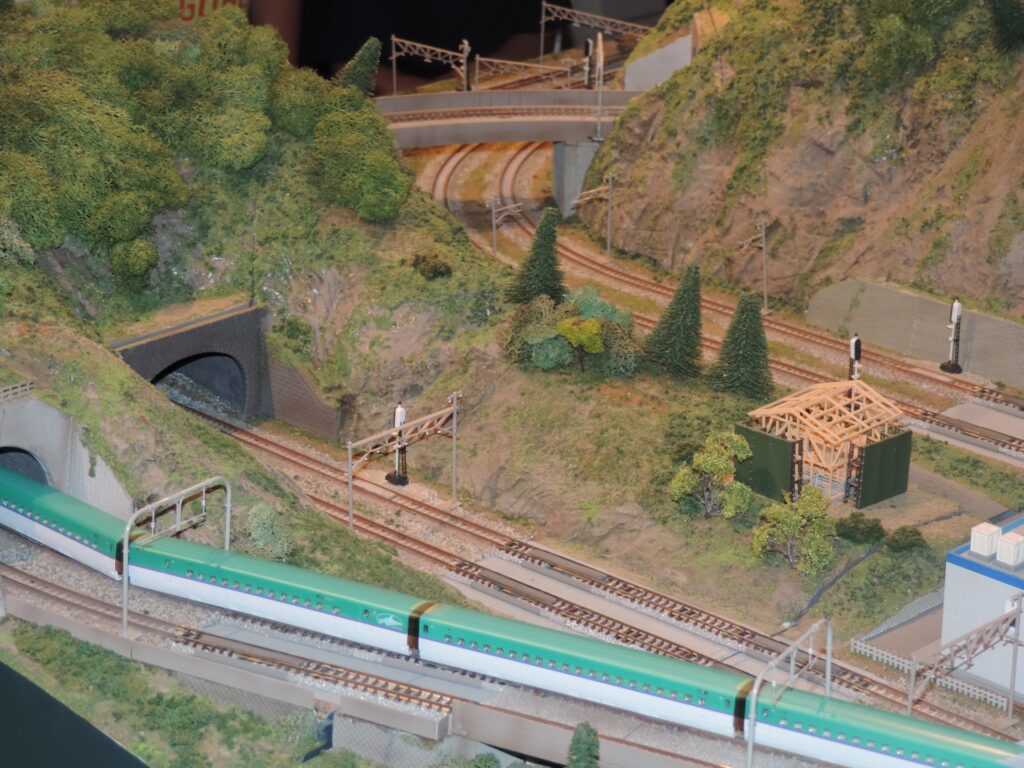 施設内には必ずといっていいほど、鉄道模型が走るジオラマがあります。
